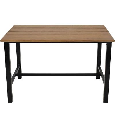 Add modern style and durability to the patio, dining room, front porch, or backyard with this sophisticated dining table. Made with a naturally weather-resistant chestnut wood tabletop with a sleek, black powder-coated steel frame, this durable table will complement a variety of industrial or rustic decor schemes. The slatted tabletop provides a unique, contemporary look. This outdoor patio table provides enough space for four average-sized adults to comfortably sit around it and is sturdy enough to support up to 200 lbs. Pair it with a modern dining bench or sophisticated set of chairs (not included). This table is easy to assemble and all of the necessary tools and hardware needed for assembly are included. If used outdoors, cover the table and store indoors in order to prolong the product life. This table is durable enough for outdoor use while remaining stylish enough for indoors.