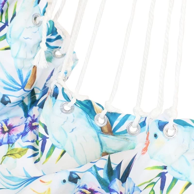 Relax and unwind by resting in this comfortable hanging hammock swing chair on the patio, deck, garden, or other living space. This hammock features fun and colorful fan palm designs for added cool, tropical style to your space. The durable polyester cover with a polypropylene fiber filling seat provides comfort and support while the material remains resistant to the elements outdoors. The padded cushion will support you as you sit back with ease, and the wooden spreader bar makes this chair versatile and stylish. The lightweight design allows you to take this hammock swing chair everywhere you go. Hang this hammock swing chair outdoors to enjoy some relaxation after a long day or hang this hammock chair indoors on any ceiling hook for a fun indoor sitting space. A quick set up allows you to spend time with loved ones outside or enjoy some quiet reading time. No matter where you hang it, this hammock swinging chair allows you to relax comfortably. Please note, a stand is not included with purchase.