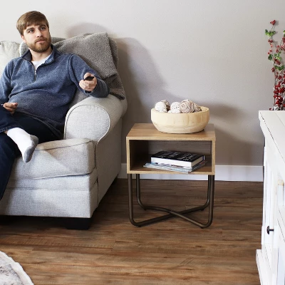Add a touch of modern sophistication to the bedroom, living room, or office with this stylish bedroom nightstand table. Built from durable, medium-density particleboard (MDP), the finish is stain- and scratch-resistant to hold up to everyday wear and tear. It features a unique cross base with four powder-coated steel legs and a faux wood tabletop for an industrial-inspired look that will complement any decor. Plus, it has four protective PVC feet to prevent the metal from scratching the floor. The small end table for bedroom also features a convenient shelf to easily tuck away messy clutter items like remotes, magazines, and drink coasters. The open-faced design makes it easy to see the items inside and easily find them without searching the room. Whether placed next to a bed, chair, or sofa, this small accent table provides a convenient surface for a lamp, houseplant, radio, family photos, and much more.